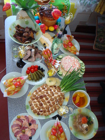 На десерт фруктовое желе. Ну и главное--бегу делать КРАШАНКИ!:)).....Еще на столе будет ассорти сырное,ассорти из свежих и маринованых овощей,рулетик из копченой рыбки,колбаска....Впервые я самостоятельно готовила праздничный стол...МАЛАДЕСЬ!:))