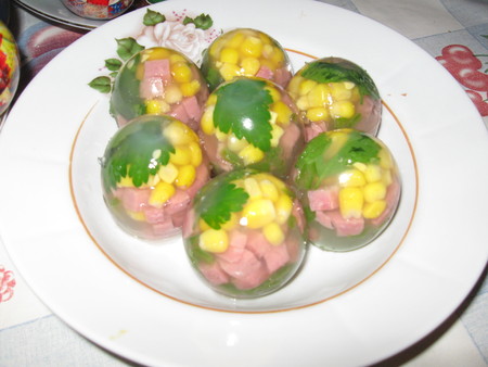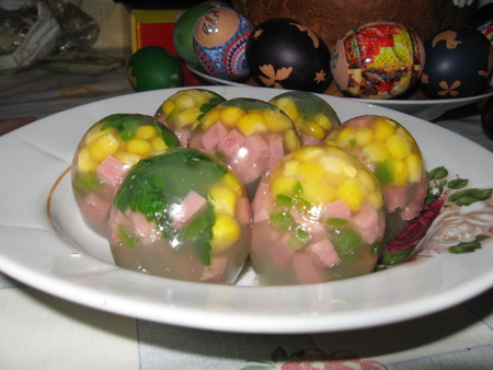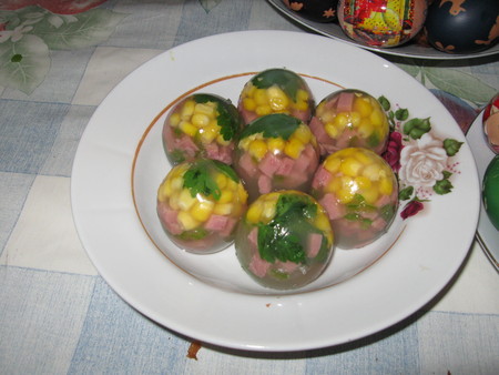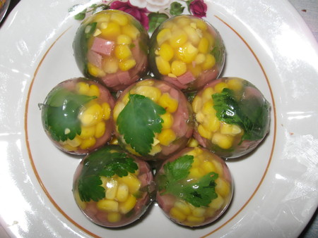 Залить бульоном с желатином. Поставить в холодильник на ночь. Затем скорлупу очистить.