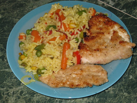 Филе курицы помыть и порезать пополам (поперек). Слегка отбить. Обвалять в смеси (панировочные сухари, соль, перец) и положить на сковороду (предварительно разогретую) с маслом. Обжарить с двух сторон. И можно подавать!
