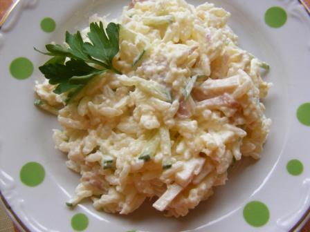 Мелко нарезать яйца, лук. Огурцы соломкой, кальмары и щуку тоже мелко порезать.Добавить рис, заправить майонезом. Вкусняшка!
