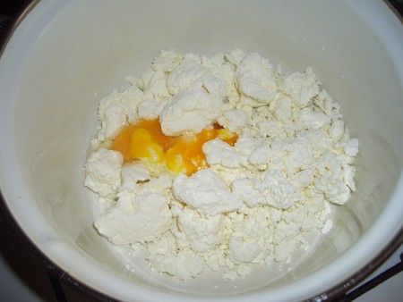 в кастрюльке растереть творог, яйца, соль,сахар, ваниль, муку, сметану, соду