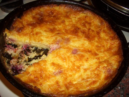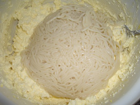 Ингредиенты: творог зернистый 400-500гр,спагетти (поломанные )либо вермишель 100-150гр., 2 яйца,6 ст.л. жирной сметаны, 4 ст.л. муки, 0,5ч.л. соли, 6 ст.л. сахара, 0,5ч.л. соды, ваниль, замороженная вишня 10-15 штук.