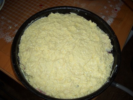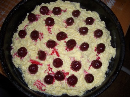хорошо перемешать, выложить половину полученной массы в смазанную сл.маслом форму и разложить вишни.
