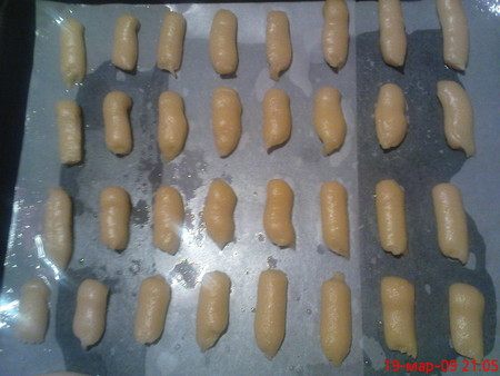 вот такие пальчики у нас должны быть..легкие и пустые внутри(мини-мини-эклерчики), продолжаем так печь, пока тесто не закончится..