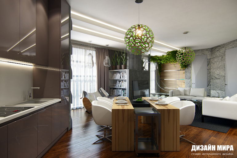 Вот уж действительно дерзкий и необычный интерьер удалось создать нашим дизайнерам. При одном взгляде на обстановку этих апартаментов общей площадью 178 м.кв. понятно - это жилье молодого, креативного современного человека. Все в этом интерьере отвечает последнему слову моды и техники.