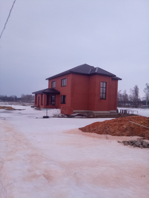 Так хотелось показать полностью готовый дом без строительных лесов, но пока не получается. Покажу то, что имеем на данный момент.