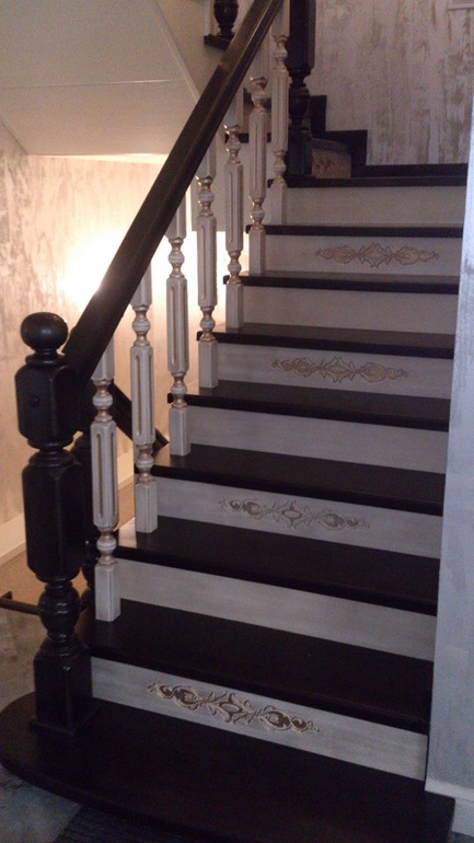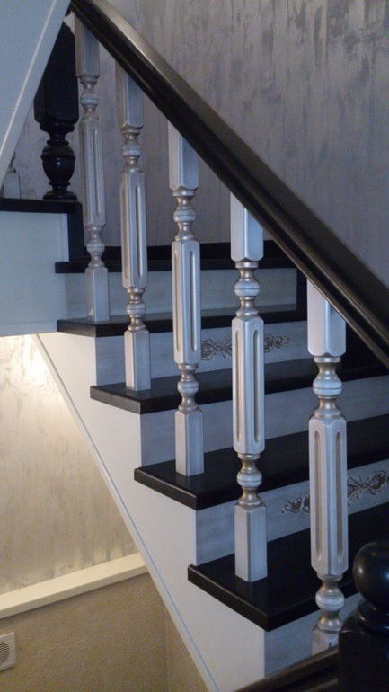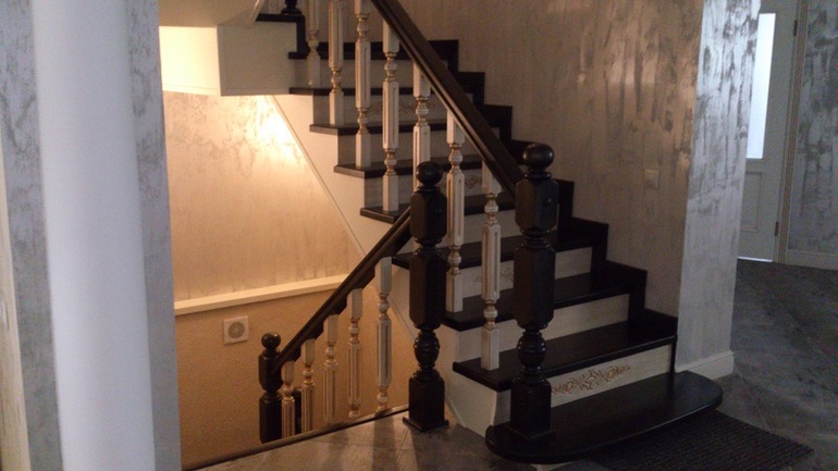 Завершающим этапом отделки нашего дома стала лестница. Долго выбирали конструкцию и цвет, еще дольше выбирали подрядчика. В итоге остановились на классической схеме с подступенниками и ограждением из деревянных балясин. Что бы немного "разбавить" цвета, решили сделать комбинированную двухцветную лестницу. Ступени и перила - "венге", подступенники и балясины - "слоновая кость" , в цвет дверей. Хотели делать кованые перила, но по интерьеру дерево подошло лучше. Подрядчика в конце концов выбрали по рекомендации знакомых. В процессе изготовления внесли несколько дополнений: элементы резьбы, и патину золотом. В итоге, после того как привезли из покраски и собрали, получилась ТАКАЯ КРАСАВИЦА!! На фото может не очень удачно, но лестница реально красивая. Цена конечно тоже не маленькая получилась, но все знакомые оценивают ее в 2-3 раза дороже, поэтому можно сказать что не переплатили)) Подрядчик http://es-tm.ru/, давайте скидку за рекламу!)