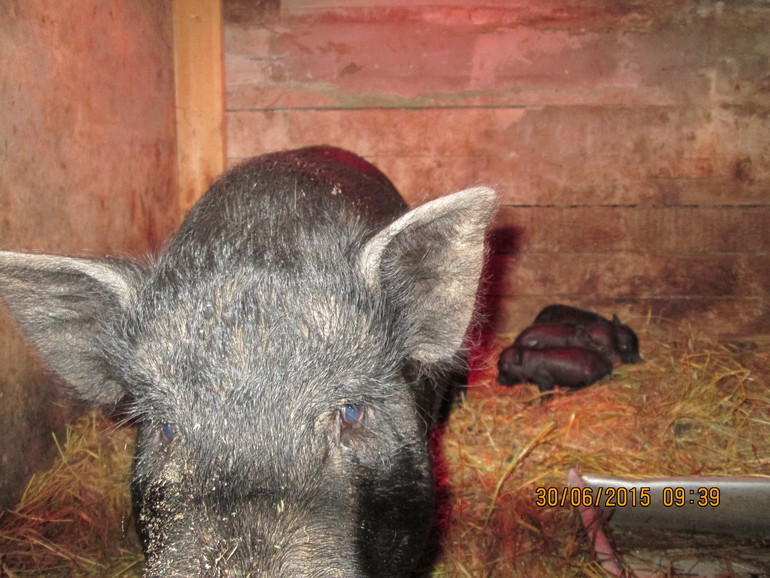 Акула - независимая по характеру, к себе близко не подпускает, в стаде ни с кем не дружит, даже к Стасу не подходит. А теперь когда стала мамой, охраняет своих четырёх "крысят", я не могу это размером с мою ладошку назвать поросятами!)