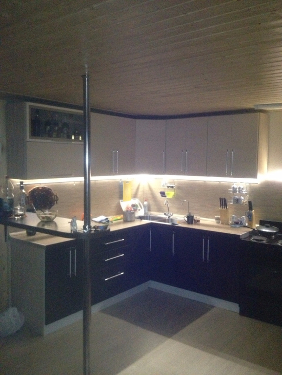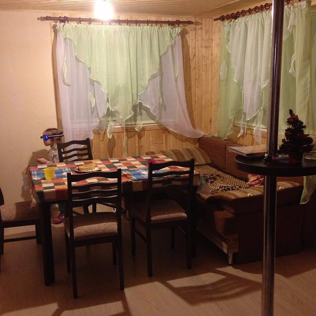 кухня - не могу найти общий вид, камнем стену так и не выложили, за то прикупили 2 дивана, шторки, огромный стол...воооообщем приличная кухня