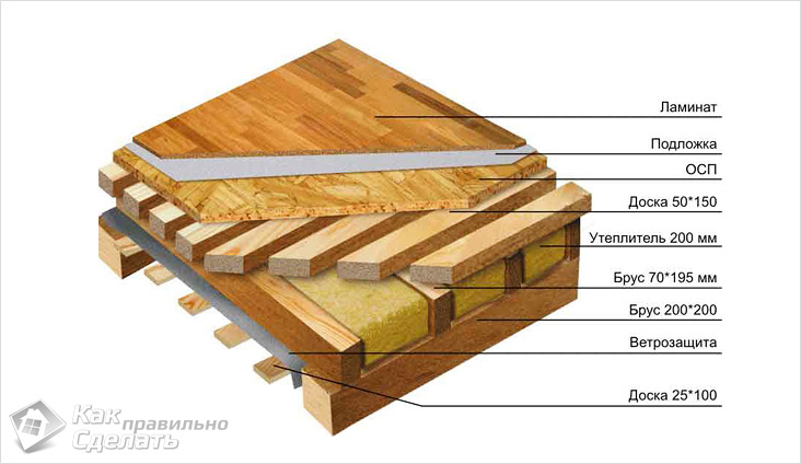 В первом варианте на обрешетку из бруса 70*195 (эту обрешетку нужно будет услилить перпендикулярно внутри местами) сразу можно положить фанеру от 18мм толщиной и сразу на нее ламинат с подложкой. Тогда доска 50 и ОСП не нужны. Вряд ли будет экономнее по деньгам за материалы (фанера не дешевле осп и доски), но работы значительно меньше на 1 слой досок.