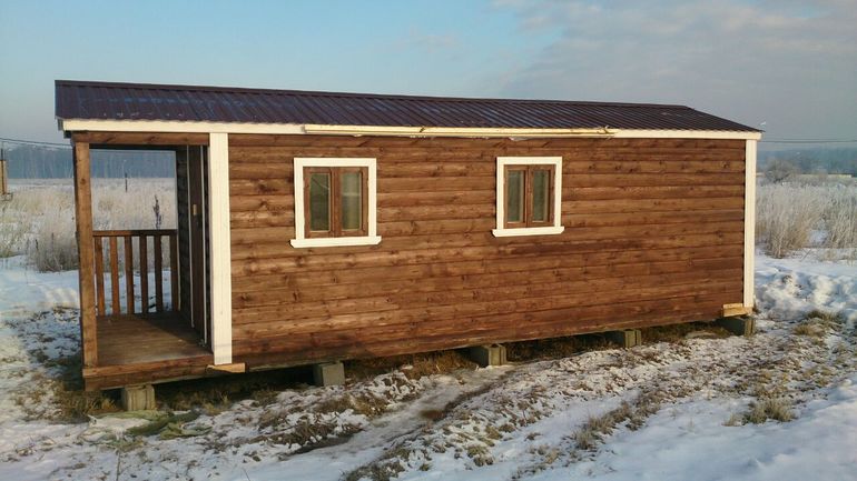 Размеры бани-бытовки 7,0х2,3 см, сделана из профилированного бруса, утеплена паклей и минватой. Потолок двускатный, муж со своими 1,92 см спокойно помещается. Внутри три комнатки - парная, санузел и столовая. В цену также входили печь, моечный поддон и покраска, проводка внутри баньки.В марте также подключили электричество.