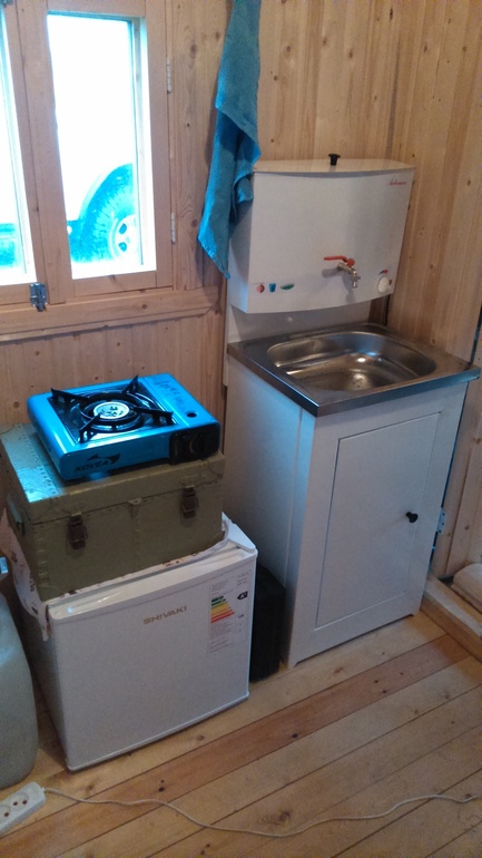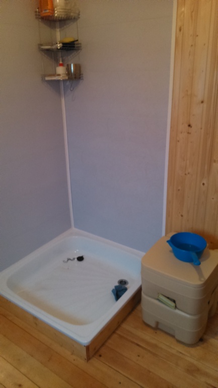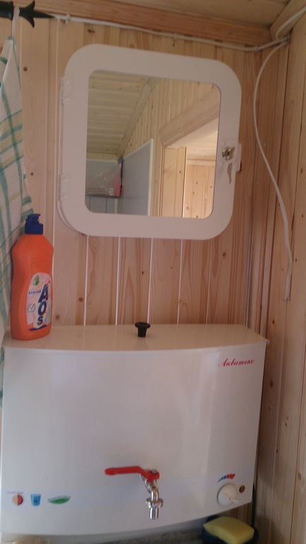 Июнь был посвящен озабориванию: смежные стороны с соседями поделили 50/50 с ними на их усмотрение. Сами себе пока сделали сварную сетку и ворота. Купили умывальник с подогревом, маленький холодильник и биотуалет, в средней комнатке решено было сделать санузел по одной стороне и кухню по другой, разделив их шторкой. в столовой примостился икеевский ящик.