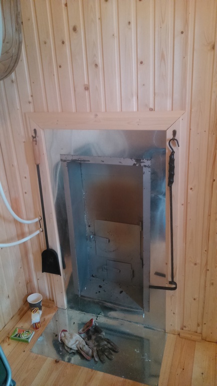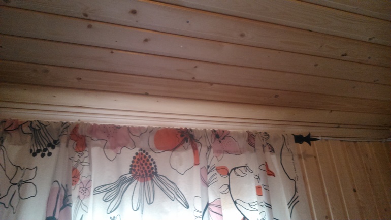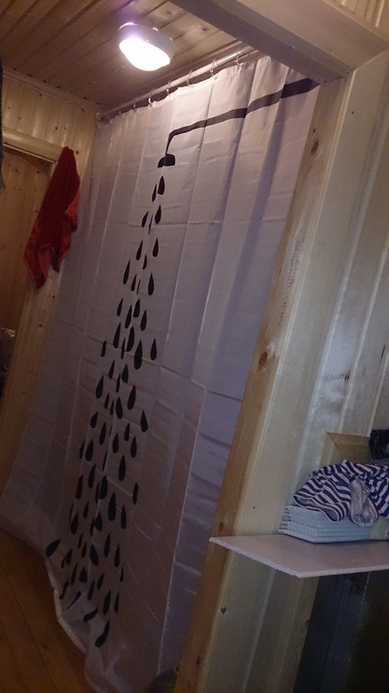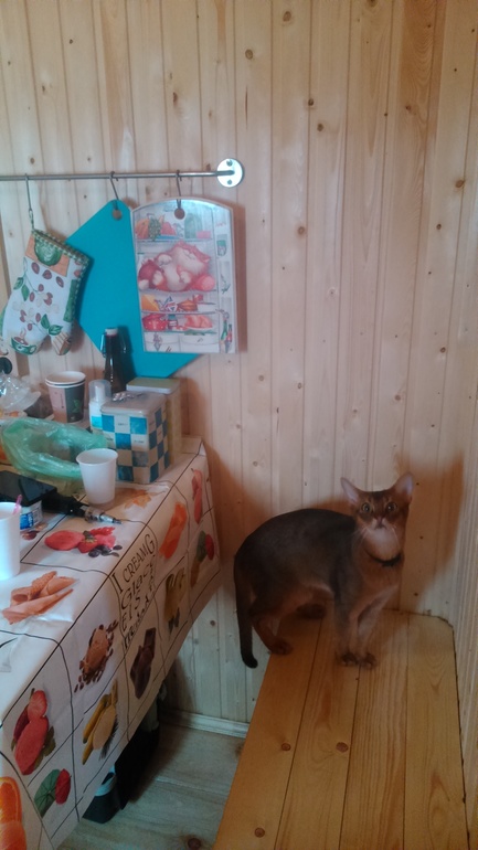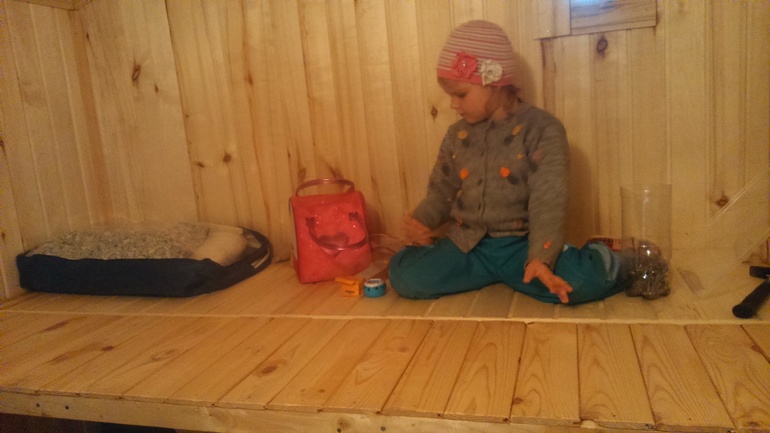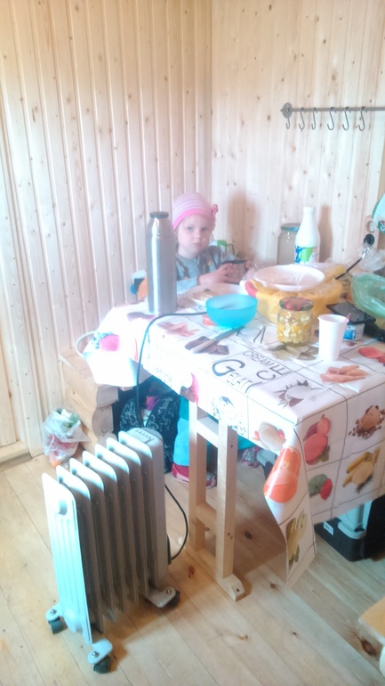 Первый раз ночевали в апреле всем семейством вместе с котом. Печка по началу коптила, пока выгорали масла. В парной решили расширить полку и сделали там себе спальню. Маленькой купили раскладушку. Кроме этого - привезли с собой всякие крючочки и рейлинги из икеи. Карнизы сделала из наконечников со старых карнизов и развалившейся вешалки для одежды.