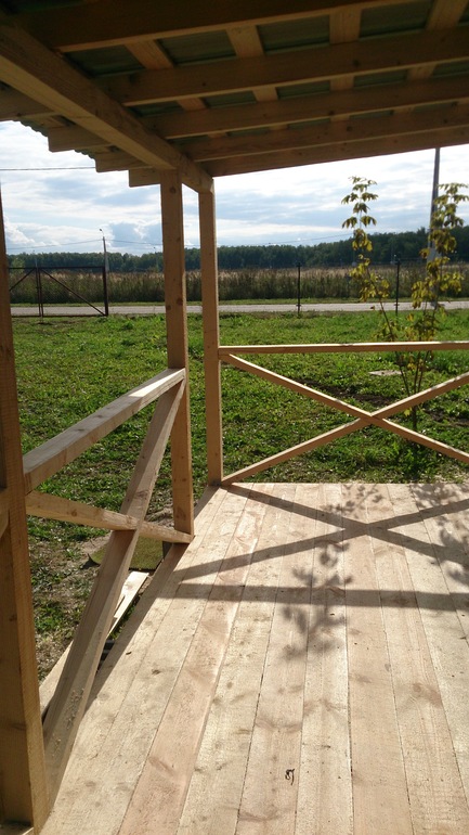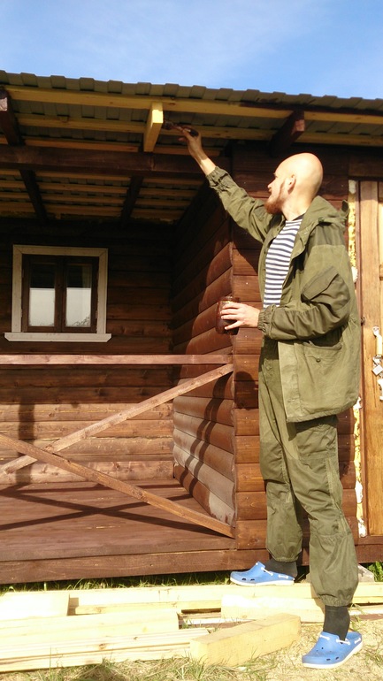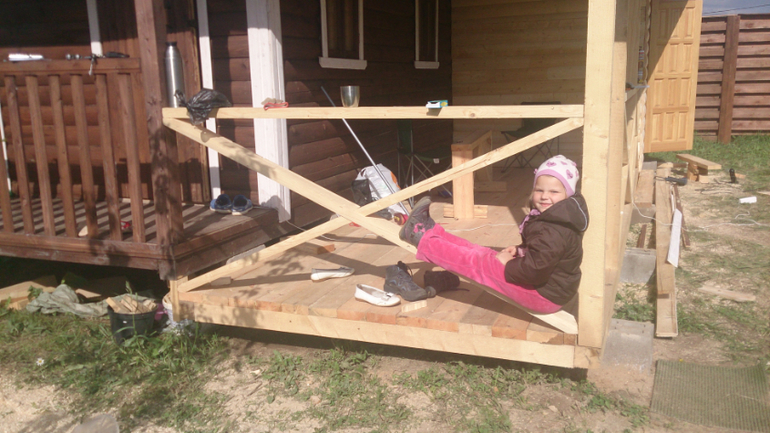 Сам каркас нам сколотили рабочие за 15 тысяч. Материал строгали, обивали блокхаусом, ставили двери и окна, красили мы все сами с мужем. Маленькая терраска от бани оказалась не очень удобна, на нее постоянно заливал дождь, мы сделали из нее прихожую. В конце большой террасы огородили часть для инструментов ми велосипедов.