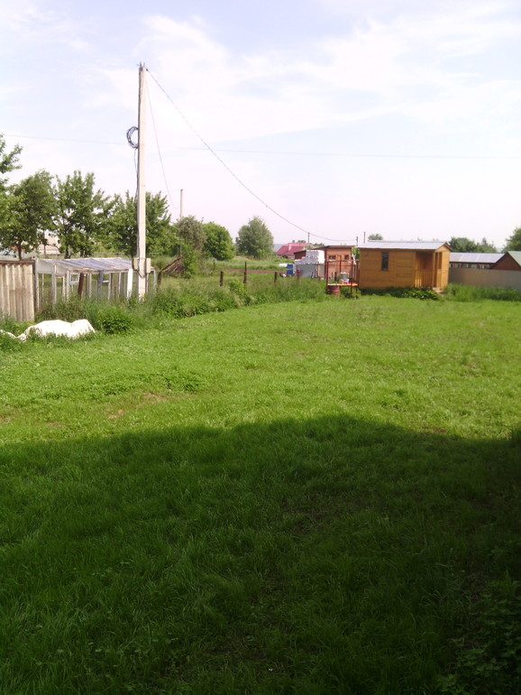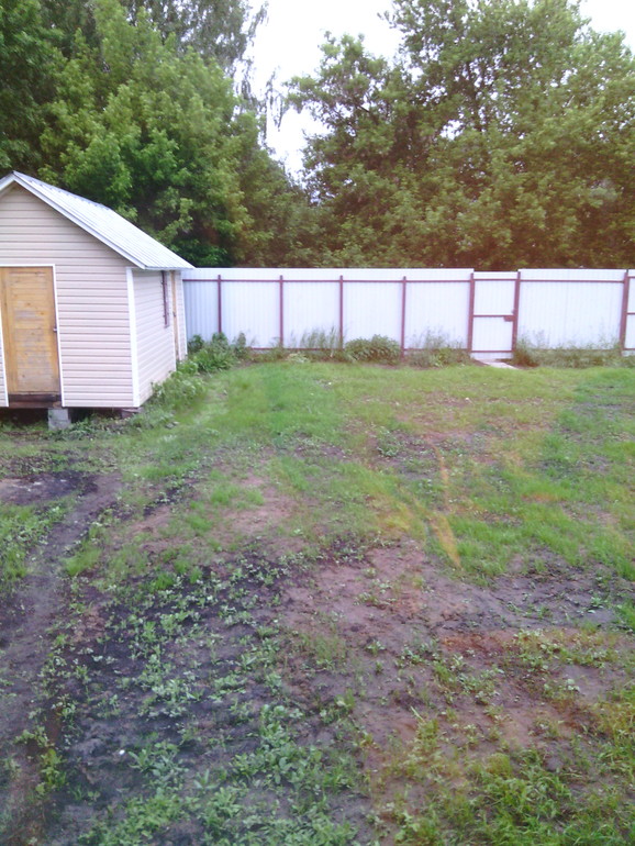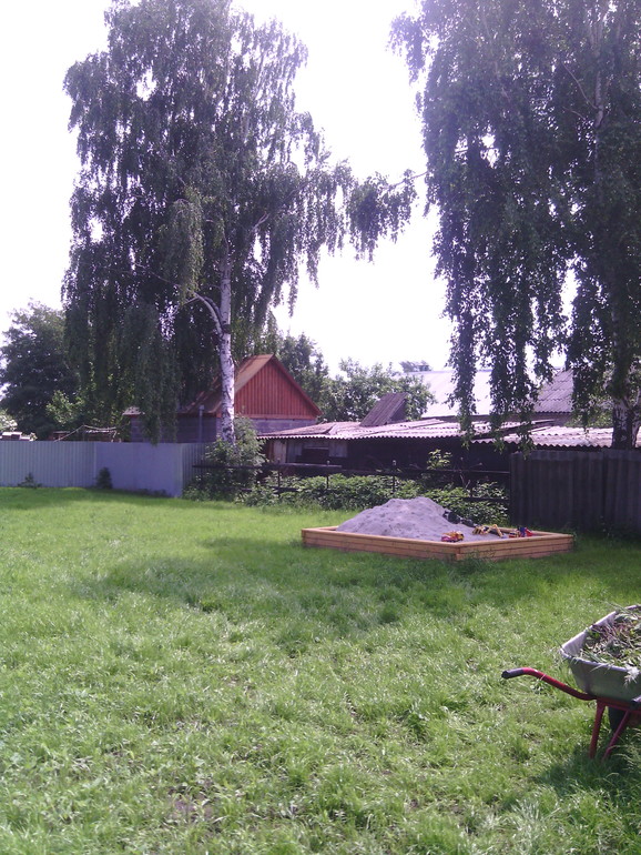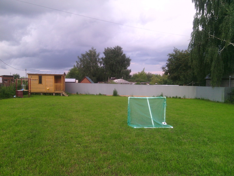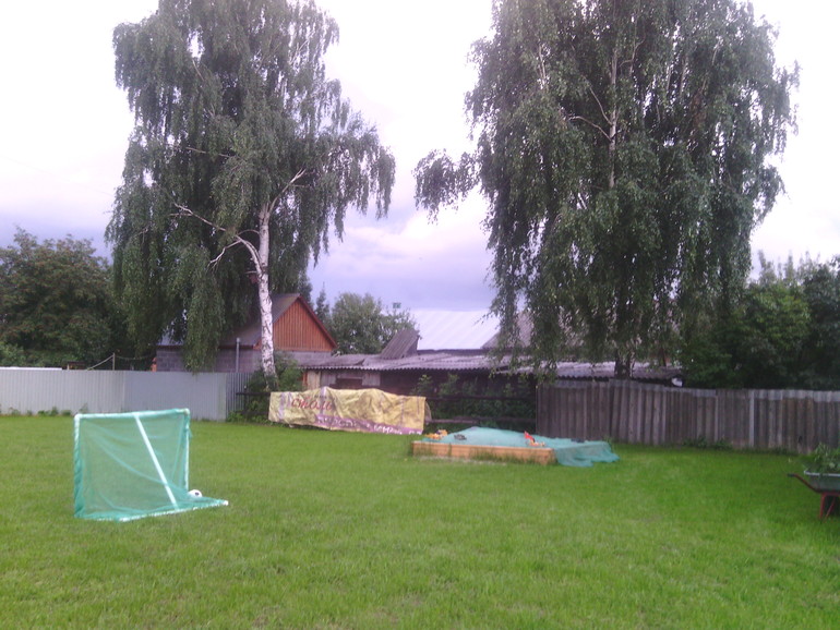 Сначала покажу что у нас снаружи стало. Мы посеяли газон по всему участку по весне, так как у нас все было перекопано и маленьким деткам где то надо было бегать.Муж сеял газон один, закатывал его как положено.А потом, бедный по ночам его отливал, так как днем были проблемы с водой и приходилось из шланга поливать ночью. Газон купили в Леруа , назывался "быстро-растущий". Специально такой брали, чтобы быстро в зашел, т.к в начале июня мы уже заезжали. Но если бы мы знали сколько с ним было бы проблем, низа что его бы не посеяли. Он действительно быстро- растущий, приходилось косить раз в три дня. К концу недели трава уже колосилась и ее было трудно косить.Так что газон этот не советую. Только к сентябрю он стал помедленнее расти. А косить нам приходилось весь участок)![]()