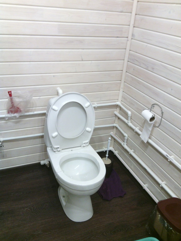 Добрый день. Спасибо). В санузле линолеум, похож на ламинат. А по всему дому ламинат. Лучше в санузле линолеум, брызги все равно на пол попадают. Мы купили кусок линолеума, он был в остатках, его даже не много нам уценили, зато хороший)