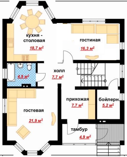 Совершенно не рациональное использование кв м. На первом этаже стену несущую не уберешь.поэтому кухню - гостинную не сделаешь.сан узел дурной, и расположение дурное.котельная 5 м - это очень мало. Второй этаж неплохой- но если Вы переделываете первый то второй тоже изменится. Но каждому,конечно своё.