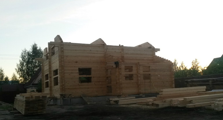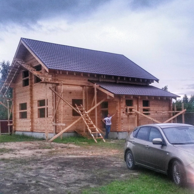 В апреле 2015 года, когда сошёл снег, мы заложили свайно-ростверковый фундамент и в мае бригада рабочих начинает собирать наш дом из профилированного бруса толщиной 150×200 по утвержденному проекту.