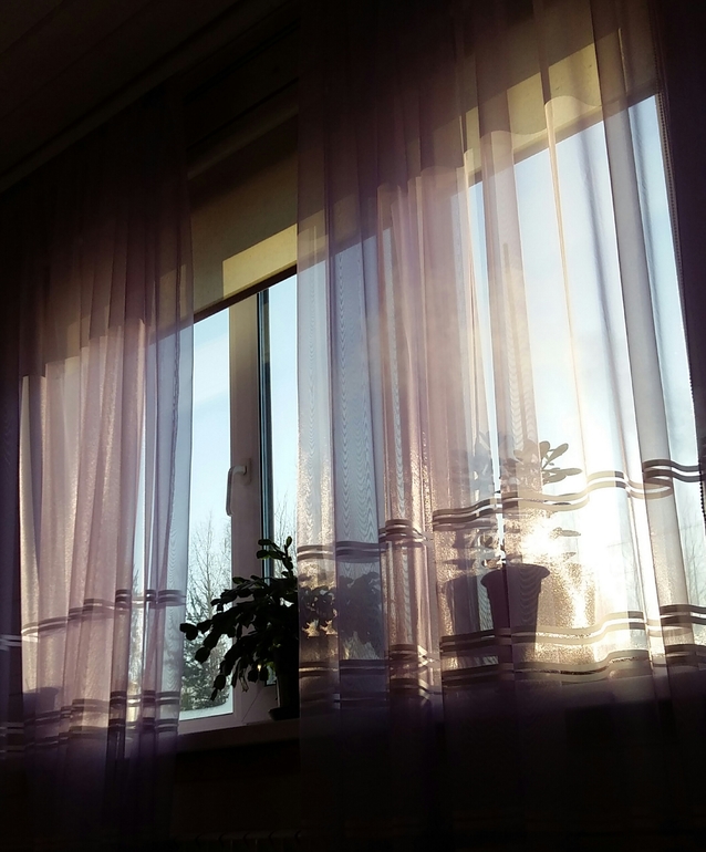 В зоне кухня-гостиная у нас 4 окна (2 трехстворчатых и 2 двухстворчатых). Плюс - много света и красивый вид, минус - очень жарко летом. Эту проблему мы решили с покупкой кондиционера, а на окна закрывают рулонные шторы и лёгкая тюль. Правда, дом, естественно, за год заметно сел и тюль придётся подрезать, т к. она лежит на полу (см.фото ниже).