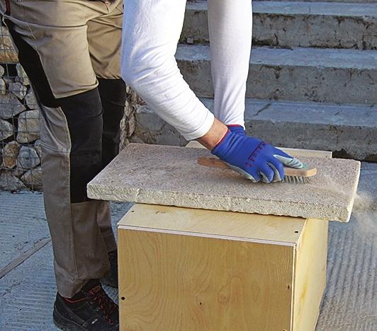 2. Для удаления цементного «молочка» обработайте тыльную поверхность ступеней металлической щеткой или болгаркой. Затем для лучшей адгезии клея с помощью кисти увлажните поверхность ступени водой.