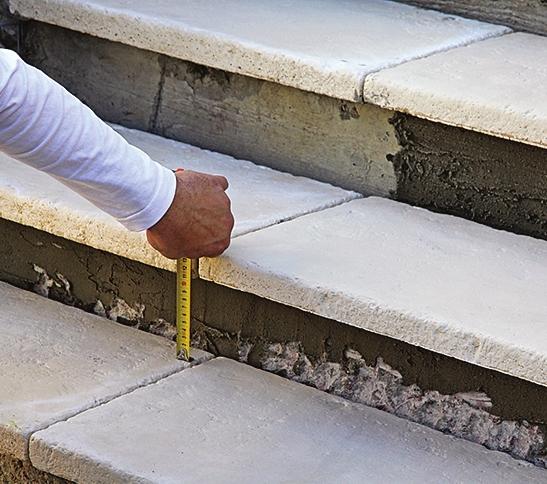 6. С помощью уровня проверьте наличие небольшого уклона при укладке ступени в направлении спуска. Произведите замеры и при необходимости подрезку следующего укладываемого элемента ступени.