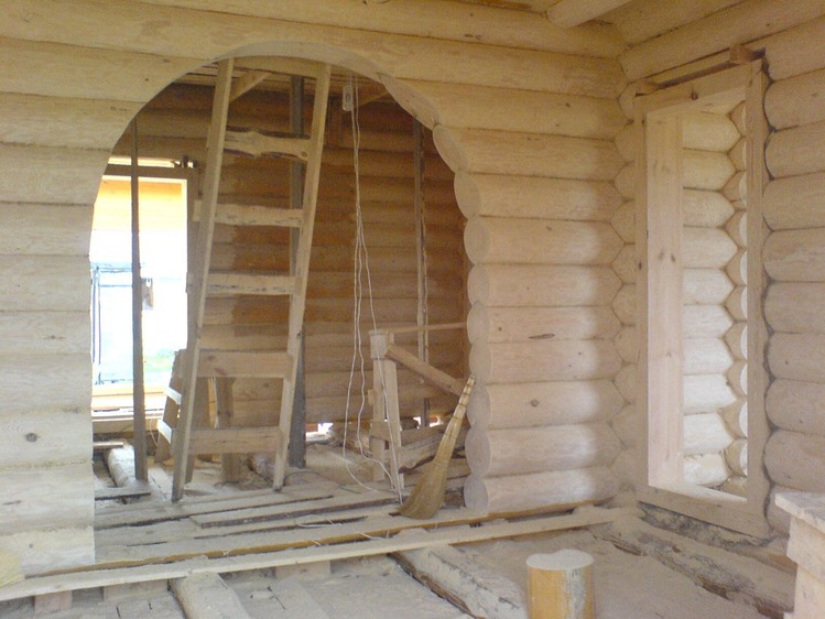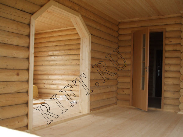 Все проемы в дереве для надежности надо укреплять впиленным в торец бруском. Такое решение (как на фото) пригодно для арки с простенкаи в 1 метр. Если простенки будут по 2 метра, то есть вероятность разъезжания бревен в арке в разные стороны. Дерево все время по чуть-чуть движется. Я уже писала.
