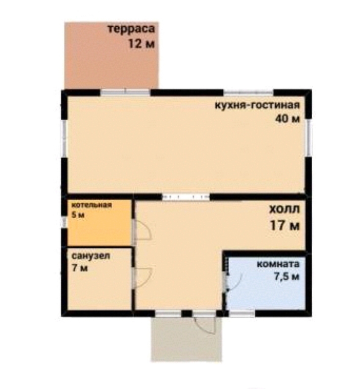 1 эт.: Кухня-гостиная (камин), комната отдыха, холл, котельная, санузел, открытая терраса 2 отдельных входа в дом.