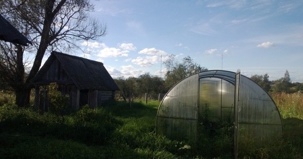Поселок развитый (магазины, храм, школа, медпункт, дом культуры, фермерские продукты, берет интернет, автобус 65 км до Старой Руссы, до Питера маршрутка, но на машине конечно удобней). Место дивное прямо на берегу реки (рыбу ловили, купались все время), много плодородной земли (25 соток), при моем неумении обращаться с землей вырастили просто кучу помидоров и огурцов. Все обнесено забором, стоят 2 теплицы (3х4 м), сад перед домом (слива, яблони, малина) и по периметру участка еще много слив, яблонь, кусты смородины, крыжовника.