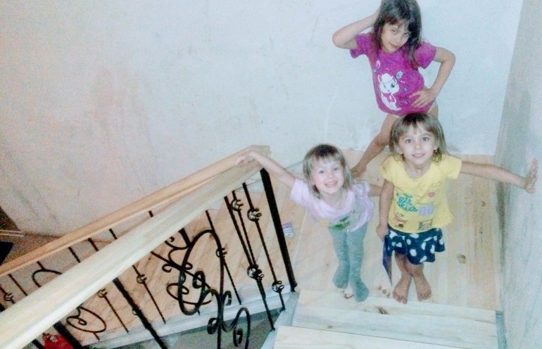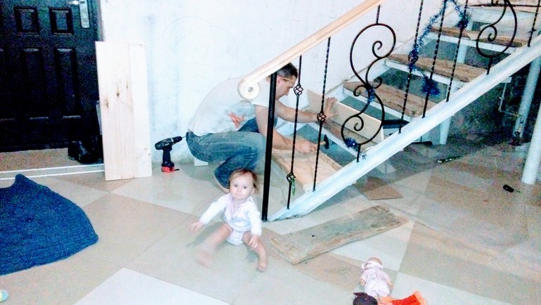 Строительство: от фундамента до крышиИтак, переехали в Новый год жить в дом. Ремонта хватит ещё надолго, но жить уже можно. Ремонт сделан в комнатах и санузлах. Муж сделал летом теплый пол, выложил керамогранитом осенью. Потом взялся за лестницу. У нас был только железный каркас. Ни перилл, ни ступеней.