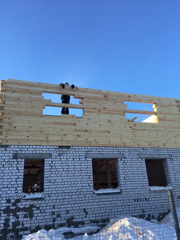 Я советую когда будете делать крышу, купить 2-3 венца уже сухого профилированого бруса и положить. И только потом крышу делать.
