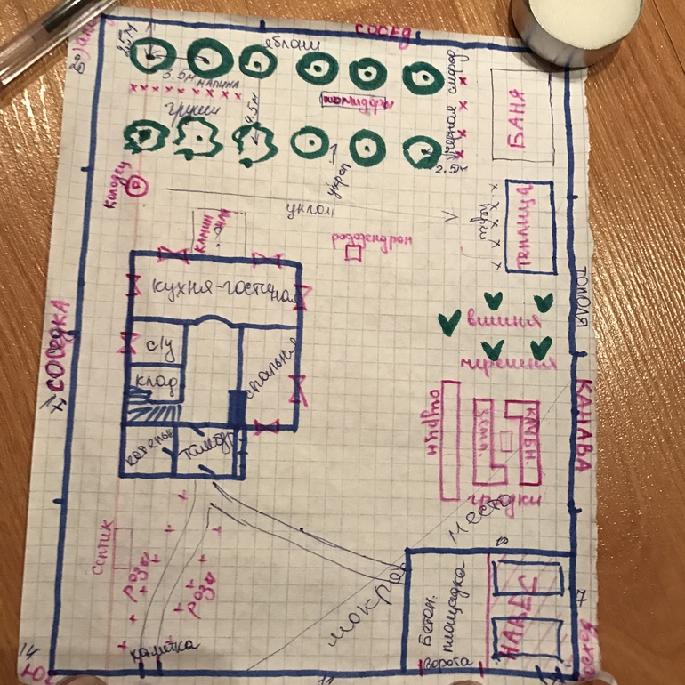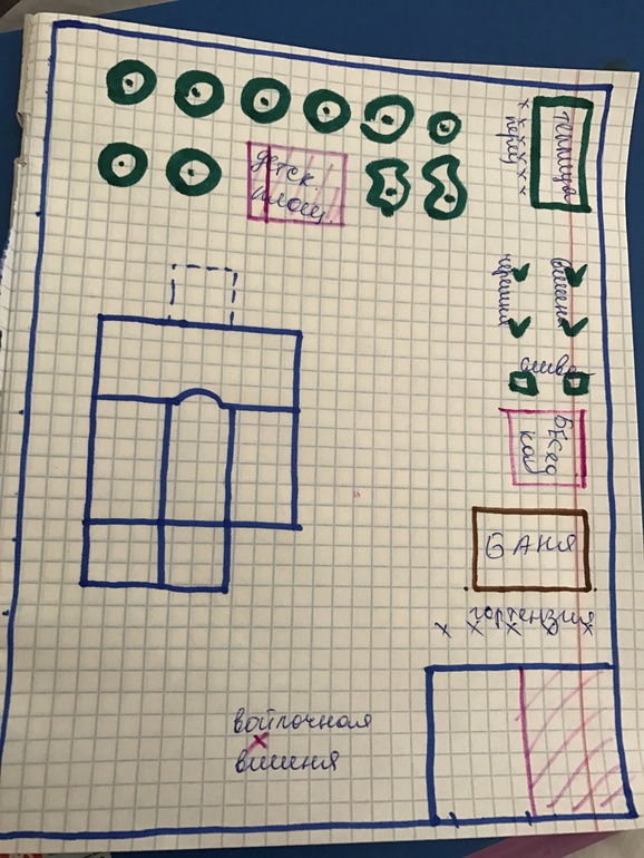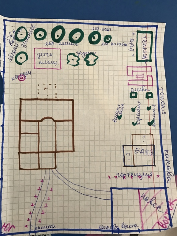 Исходя из всего этого надо придумать хорошее расположение бани (муж хотел в правом дальнем углу из за близости канавы, для слива)