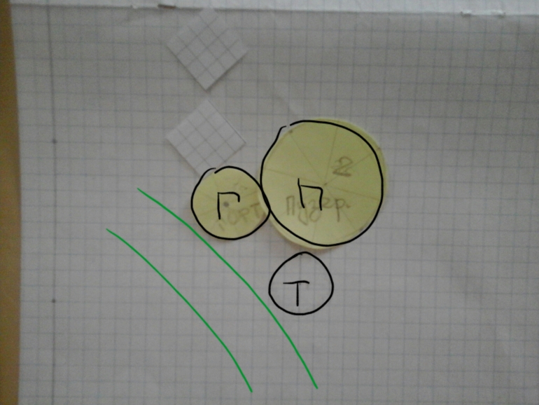 Вот пока 2 моих варианта, на которых остановилась. Черная дуга-это будущая металлическая арка, будет увита скорее всего клематисом, фиолетовое-пузыреплодник, высокое темно-зелёное- туя и круглый кустик-гортензия. На плане старалась соблюсти пропорции, 4 тетрадных клеточки-это 1 метр. На пузыреплодник оставила 2метра диаметр, на тую и гортензию 1-1.5метра.