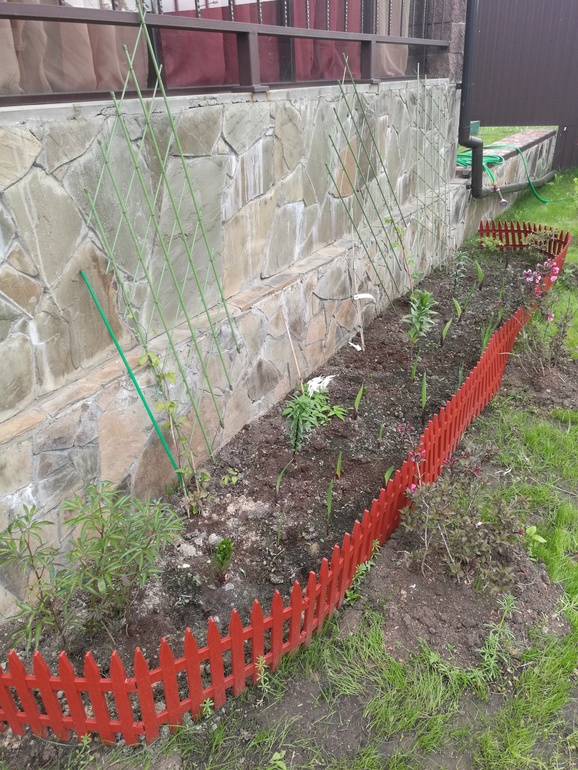Под верандой сделала новую клумбу в ней клематисы хочу что бы по перилам вились , пионы, лилии, ирисы, гладиолусы.
