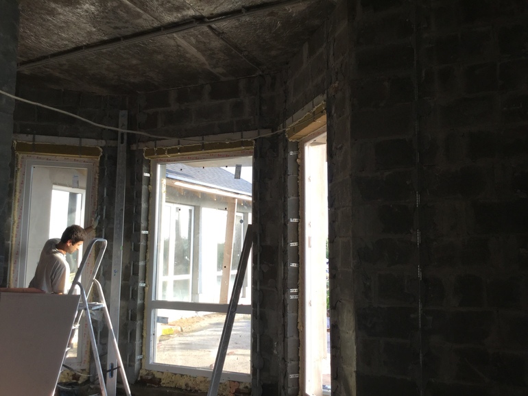 Тем временем внутри почти закончена разводка электрики, начали работать штукатуры. За неделю поставили маяки, завтра привезут машину и начнут штукатурить. Обещали все работы сделать за 2 недели, но пока крайне сомнительно.