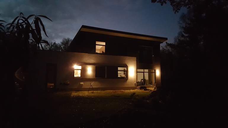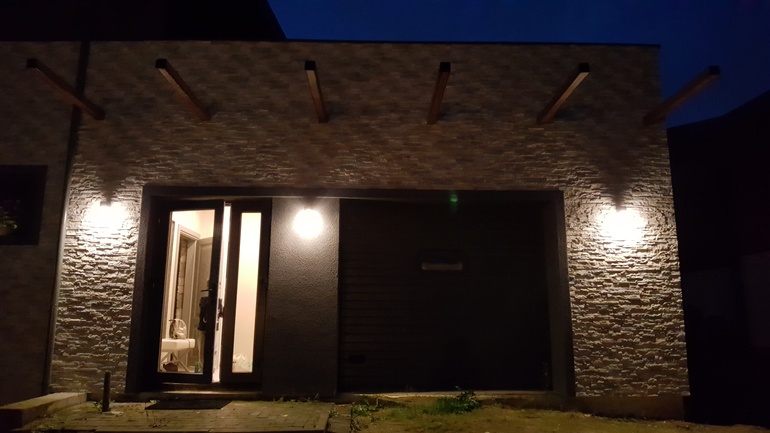 Хвастушки:)Купили саетильники на фасад. Светодиодные по 10вт. конечно кучи земли и песок красоты не прибавляют, но, надеюсь, в следующем году наведем порядок и во дворе.