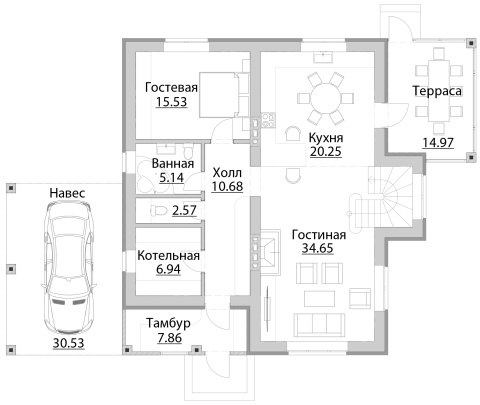 Если раздельный санузел не нужен на первом этаже, то есть такое предложение: присоедините туалет к котельной, вход в котельную перенесите в тамбур. А у самой котельной «отщепните» нишу в пользу шкафа в прихожей. Шкаф будет заподлицо со стеной, коридор останется просторным, напротив этого шкафа встанет банкетка, тумба - то, что понадобится. А то сейчас если в прихожей поставить шкаф, как нарисовано на плане, получится узкий неуютный вагон, а не прихожая.