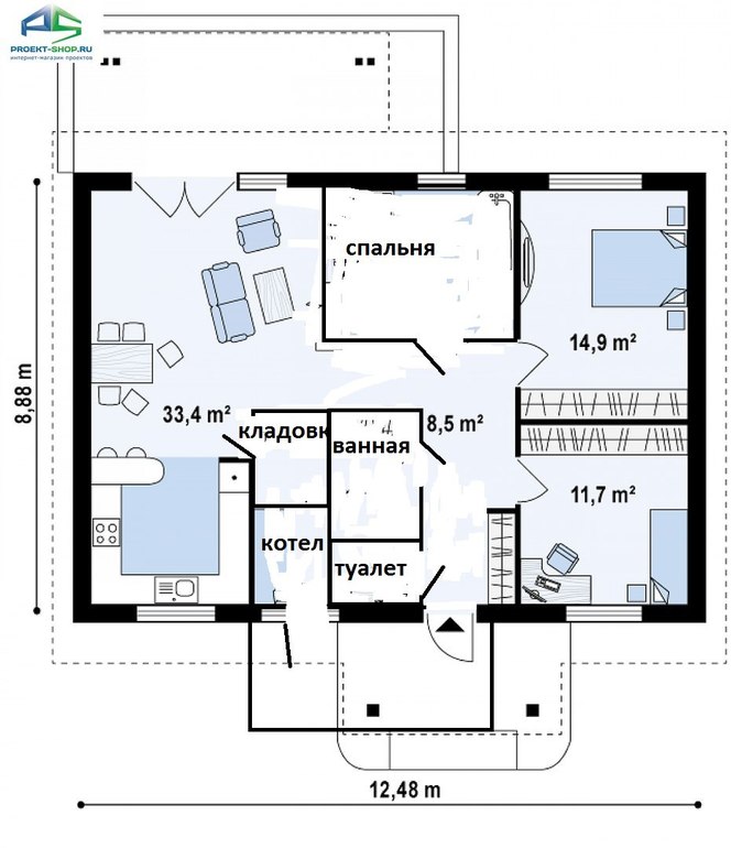 Мы строим по проекту z7, он более удачный в этом плане. Спальни расположены в правой части дома, а гостиная в левой. Топочная есть, вход в нее из кухни, там же поставили доп унитаз и стиралку.