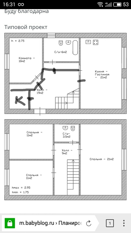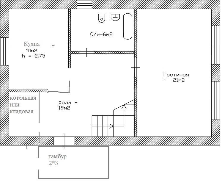 Таня, я бы не делала кухню отдельно. Оставь там комнату, она пригодится. 21 кв.м - можно размкстить кухню-гостиную, это очень удобно. Для котельной в прихожей маловато места и воду тащить далеко, лучше сделать там полноценную гардеробную-кладовку. Жалко планы без размеров. Санузел на первом этаже довольно большой, там можно разместить стиралку и сделать потолочную сушилку с электроприводом. Ванну лучше расположить на втором этаже, а не на первом. Рядом со спальнями. На первом этаже достаточно душа. А котел можно повесить в кухне. Либо весь санузел первого этажа отдать под котельную и отделить только маленький гостевой туалет. У родственников в Саратове сделан проходной санузел в котельную. Двери пока нет, котел висит, не знаю, как им разрешили. У нас стиральная машина в котельной стоит. В большой спальне я бы наоборот с другой стороны отделила второй санузел для вас с мужем. А вместо гардеробной можно сделать встроенный шкаф во всю стену.