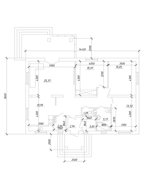 Котельная справа ,в нее вход из тамбура. Слева от тамбура кладовая, далее илет кухня совмещенная с гостинной, 3 спальни,2 санузла. Вход-это юг,гостинная,спальни-север.
