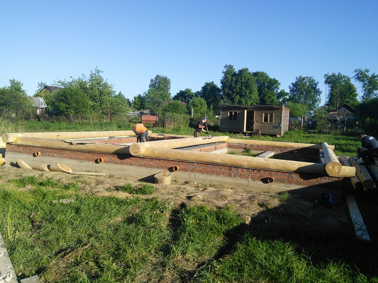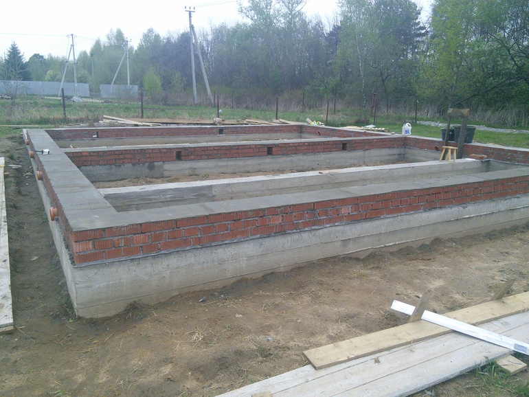 Потом фундамент,ребята - строители работали быстро и качественно.Потом,муж выкладывал с рабочим на фундамент кирпичную кладку...