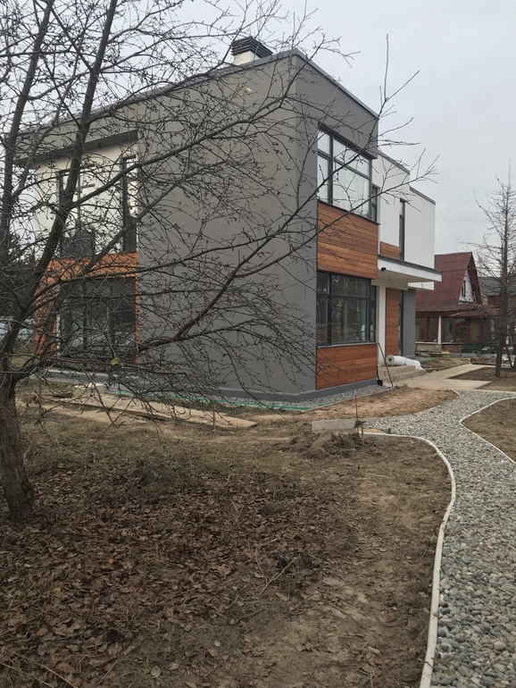 Для начала - цоколь отделали, отмостку соорудили. Протянули электрику. Разложили часть дорожек, разровняли участок, поставили, наконец, забор!