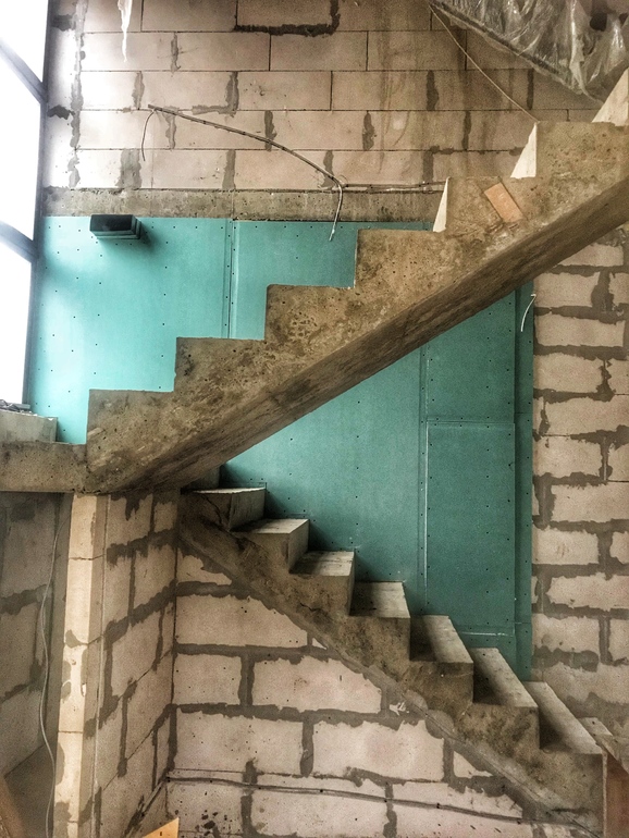 Стяжки все готовы, появилась гипсокартоновая стена между гостевой спальней и лестницей.