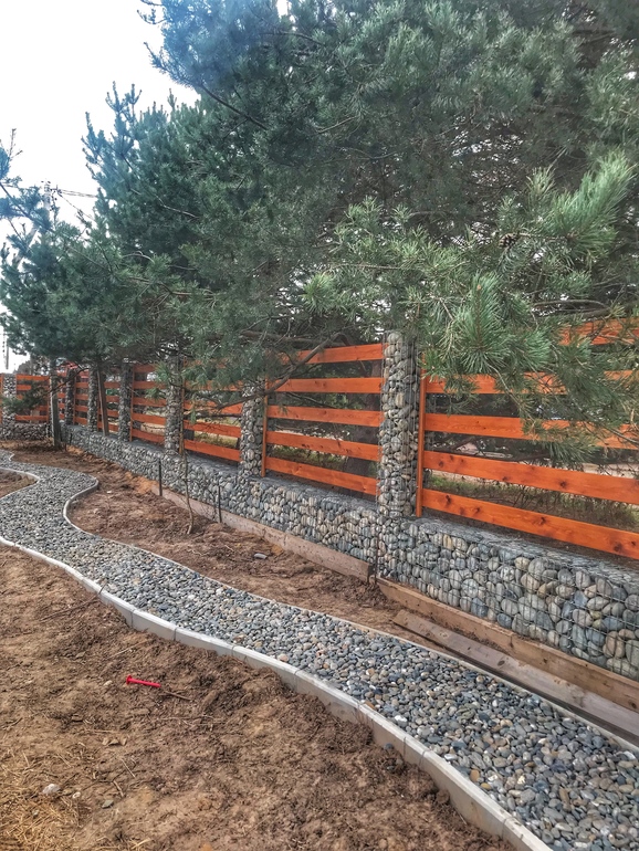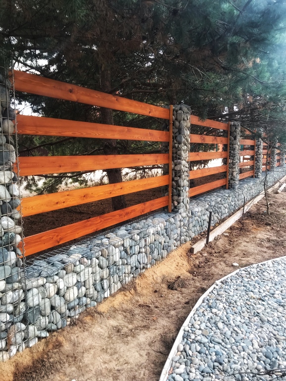 Внутри габионов металлические столбы и связующие горизонтальные элементы по цоколю. Столбы заглублены, они выполняют роль каркаса К металлическим опорам приварены «уши» для крепления деревянных секций.. Остальное делают габионы))