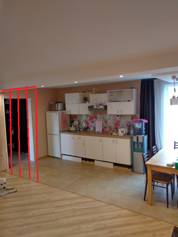 Балка то, я так понимаю несущая, врядли муж ее для красоты ее сделал..я думаю, единственное, что смогут предложить строители, поднимать перекрытие, это считай, дом перестраивать, что конечно, вам уже не вариант... Попробуйте обратиться к дизайнерам. Может есть какие-то способы просто визуально сделать менее заметным этот недостаток. Иногда грамотно расположенная подсветка светодиодными лентами зрительно преподнимает потолок. Потом, у вас потолок какой? гипрок или натяжной? если натяжной, то глянцевый, хоть и не камильфо в современном интерьере считается, но все же слегка убирает ощущений давящего потолка. Если гипрок, то возможно натяжной чуть бы сэкономил см? у нас тоже низкие потолки в доме и мне хочется биться за каждый см, муж сказал, что гипрочный ниже получится чем натяжной, поэтому будем делать последний. С балкой, возможно, по пути: если не получается скрыть недостаток, то нужно напротив сделать видимым, но как-то обыграть? У вас эта балка, получается, еще и делит зону кухни и гостиной? Может возвести перегородки небольшие по бокам как-то? т.е. чтобы получился как бы большой проем между двумя этими зонами и тогда балка сверху была бы конструктивной частью проема, а не смотрелась бы просто низко висящей балкой? У вас там как раз с одной стороны у кухни проход куда-то, вот и был бы чуть скрыт от глаз из зоны гостиной. С другой вроде стол впритык получается и дверь рядом, наверное не выйдет...Типа такого