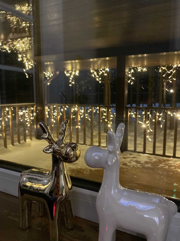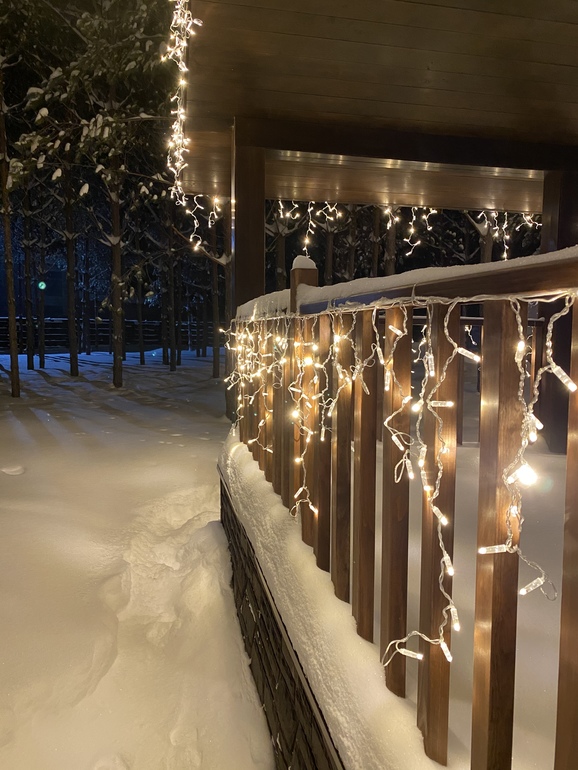 В этом году доделали почти все перила, и решили заказать оформление дома гирляндами, получился вот такой полный "джинглбэлс".