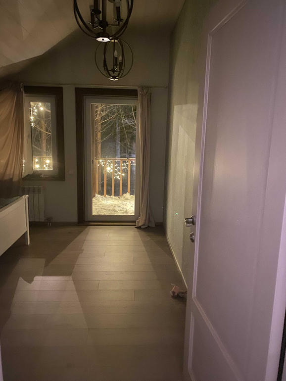 Мы фасады не украшали. Не очень к стилю подходит. Фасадный свет есть обычный. А вот в доме огни повесили. Осталось тамбур ещё подсветить изнутри))))