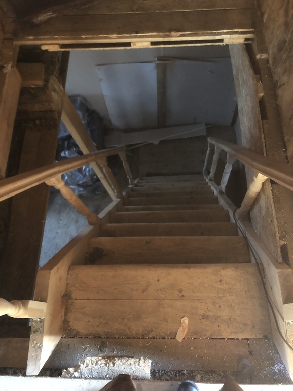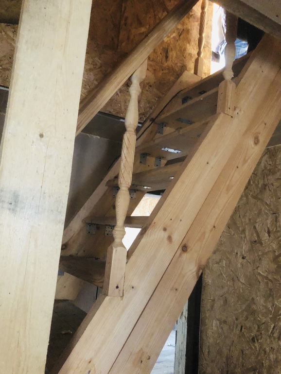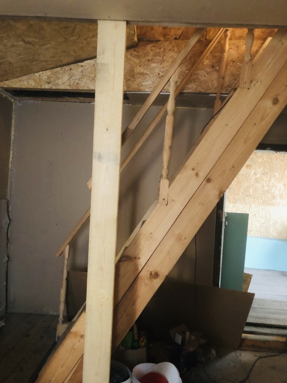 И у нас она висит в воздухе, потому как между балок. А там по метру всего, иначе никак не сделать. Когда по плану был второй свет (это большая дыра над лестницей), то марш был пологий и в середине комнаты...