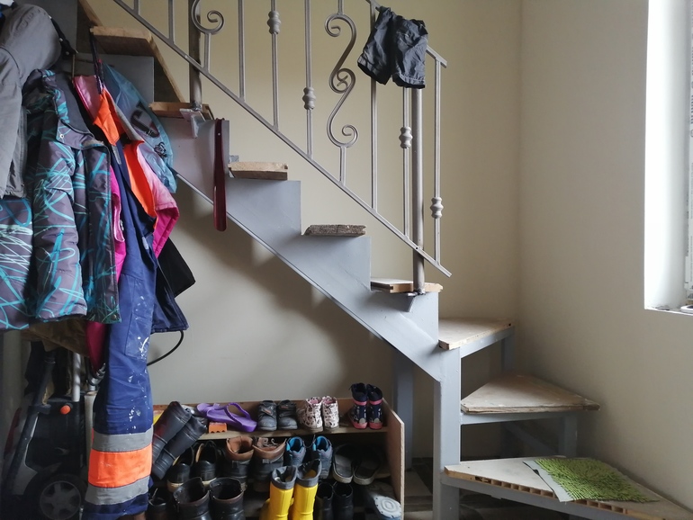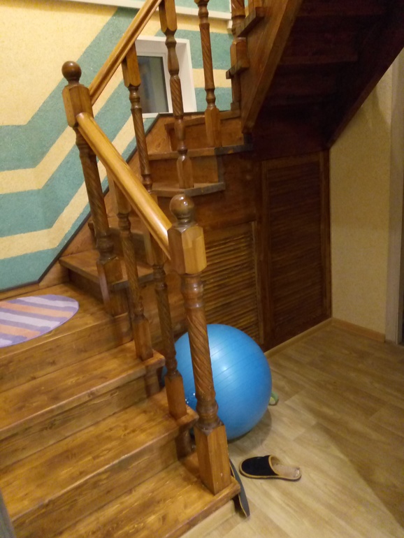 У нас так же лестница в углу и нужно было ее не делать круто, а е ли полого, то все высокие члены семьи стукались бы головой. В итоге все-таки решили на две ступени в противоположном направлении и две поворотные ступени. Внизу под лестницей холодильник и кухонный пенал.
