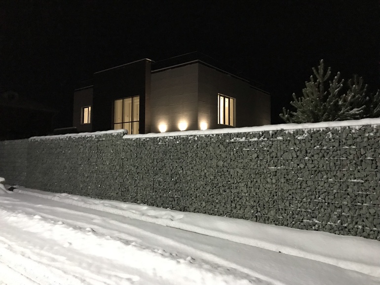 У нас забор из габионов. А между нами и соседями габионы и забор и подпорная стена.