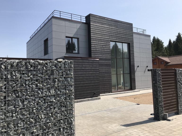С нашим домом кирпич совершенно странно бы смотрелся. Мы выбирали из планкена и бетонного штукатуренного забора помимо габионов.